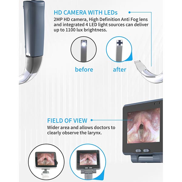 3. Широкое поле зрения: мы сделали угол обзора этого ларингоскопа приятным и широким, поэтому вы получаете более широкий и четкий обзор. Врачи и операторы могут легко увидеть структуру гортани, уловить все мельчайшие анатомические детали и провести процедуры. сделали быстрее и точнее